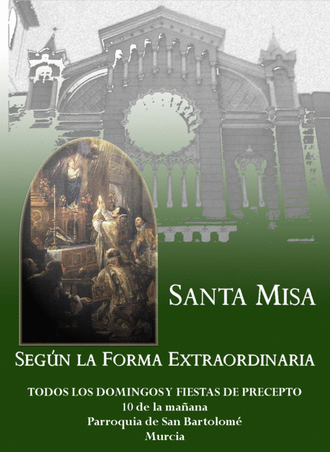 A partir del día 8 de Febrero, con una Misa Cantada, se comenzará a celebrar la Santa Misa -según la Forma Extraordinaria-, en la Diócesis de Cartagena, todos los domingos y fiestas de precepto. Será en la Parroquia de San Bartolomé de Murcia, a las 10 de la mañana.