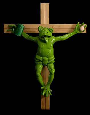El objeto de polémica es una pieza de un metro de altura en la que aparece crucificada una rana verde, que con una anca sujeta una jarra de cerveza y con la otra un huevo.
